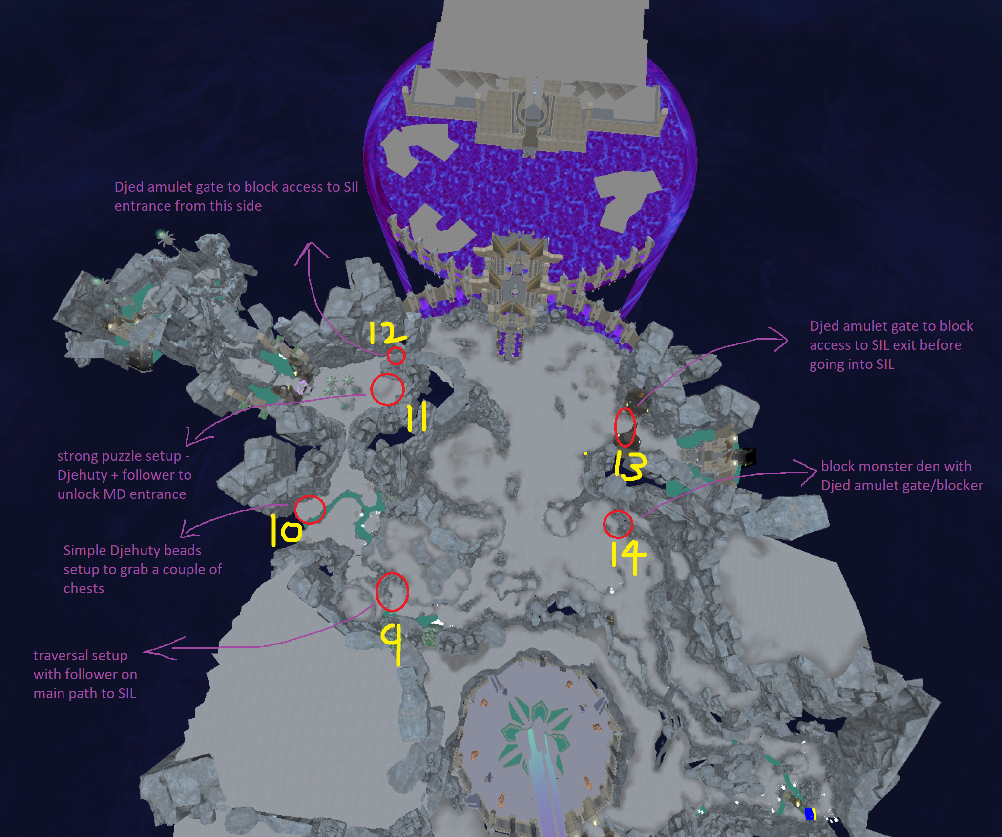 Top down map showing pacing of different gameplay setups around the entire hub.